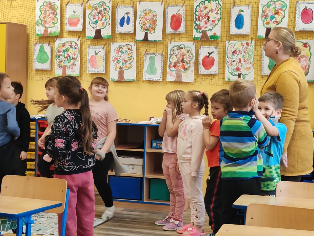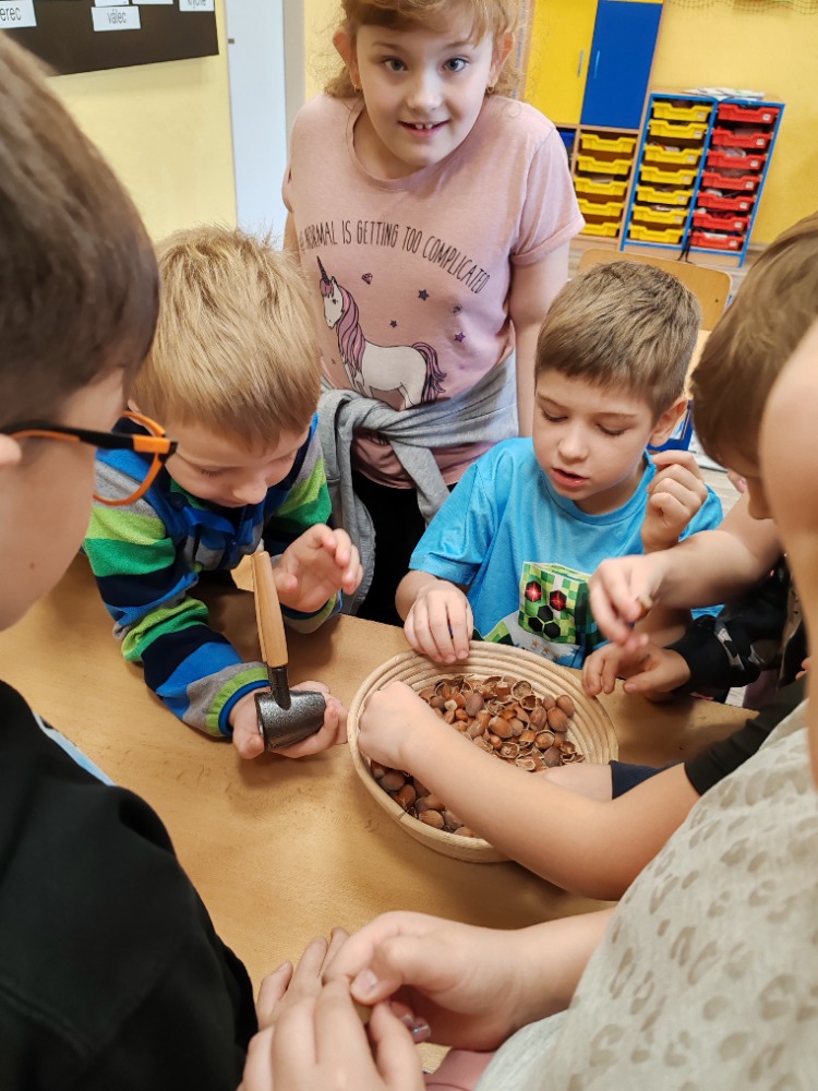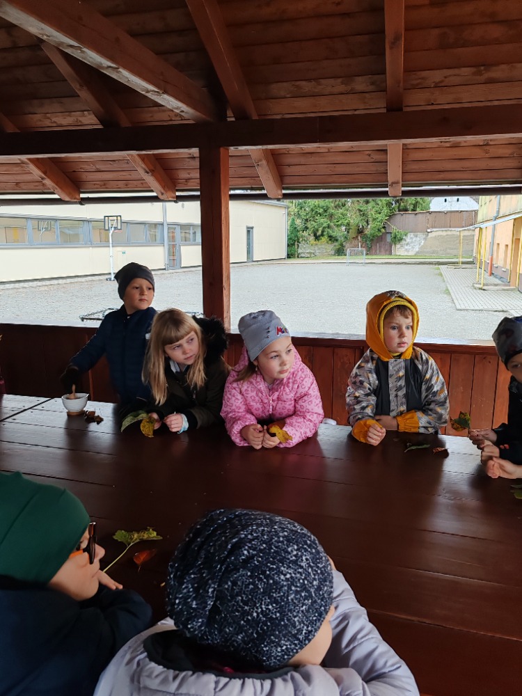 Celý program byl rozdělen na dvě části. V té první se děti dozvěděly, proč a jak se mění příroda na podzim a co se děje se spadlým listím. Nechybělo ani bádání a poznávání jednotlivých listů na naší malé školní zahrádce. Děti si je mohly také barevně dotvořit podle vlastní fantazie. Práce jim šla od ruky - vytvořily si skupinky, ve kterých se vzájemně podporovaly a pomáhaly si.